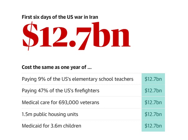 2月28日,美军一枚战斧导弹击中伊朗一女子小学,造成175人死亡。单枚战斧导弹造价约350万美元。据估算,战争前六日美军已发射超过300枚战斧导弹,总耗资12亿美元。美军官员称,截至第六日已打击2500余个目标。仅进攻性打击弹药的估算成本就达55亿美元。 美军动用“萨德”等拦截系统,相关支出约57亿美元。 加上14亿美元战损及2700万美元作战费用,战争前六日总成本预估达127亿美元。