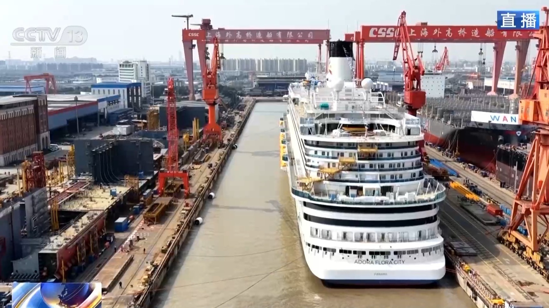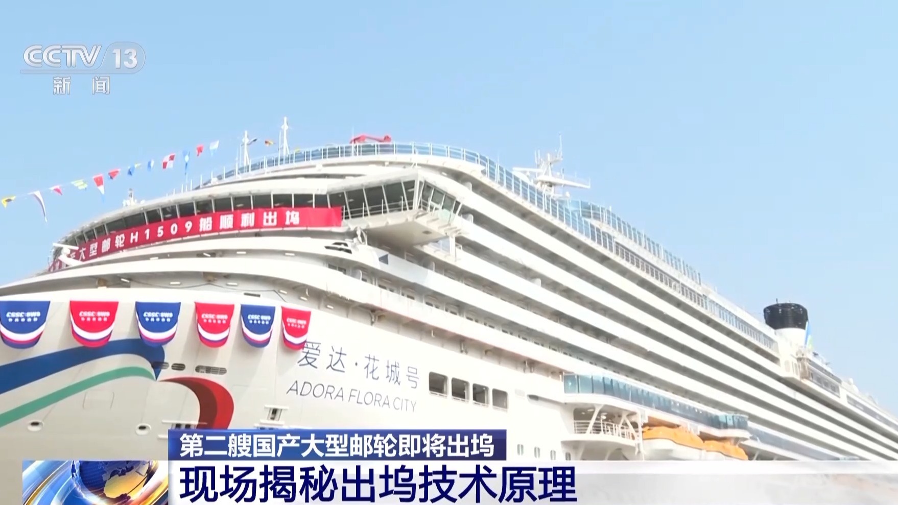 总台记者 肖冰毅:我现在所在中船集团上海外高桥造船的2号船坞旁。此刻,第二艘国产大型邮轮“爱达·花城号”已经挂上了彩旗,整装待发。再过三个小时左右,就将正式开始出坞作业,这艘海上的移动花城将移泊到码头位置,这也标志着这艘船的主体建造工作已基本完成,转入下一步的内装建造和试验工作当中。