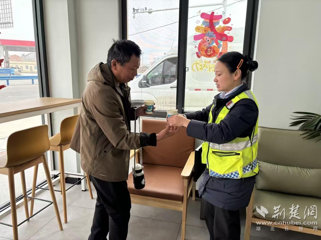 工作人员借助爱心小屋常备的热水、饮用水等便民物资,细心调试好水温,协助家长为孩童冲泡奶粉,及时安抚了孩子的情绪。随后,工作人员又耐心为司乘详细规划行驶路线,清晰指明行进方向,切实解决了司乘的出行困扰。