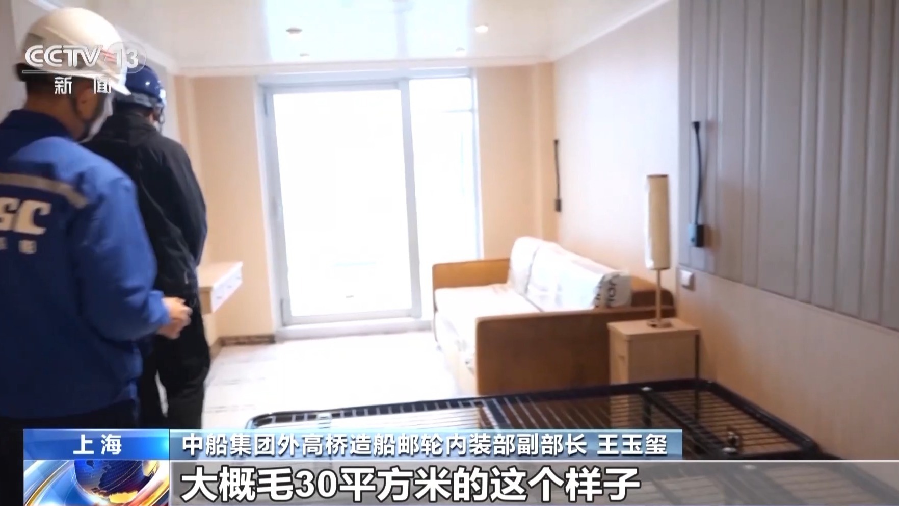 中船集团外高桥造船邮轮内装部副部长 王玉玺:这是比较大的一个套房,大概毛30平方米,而且还自带一个小露台,未来会有小躺椅等。