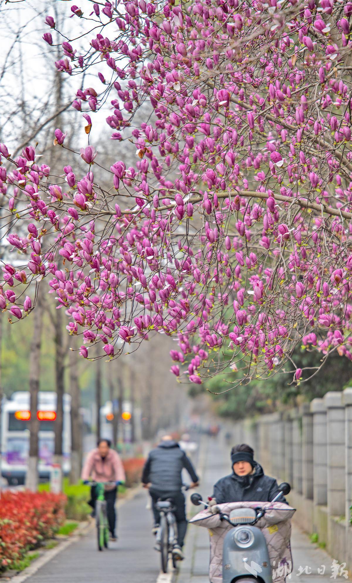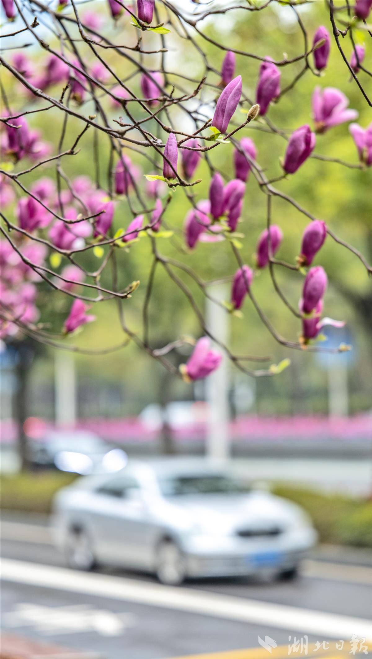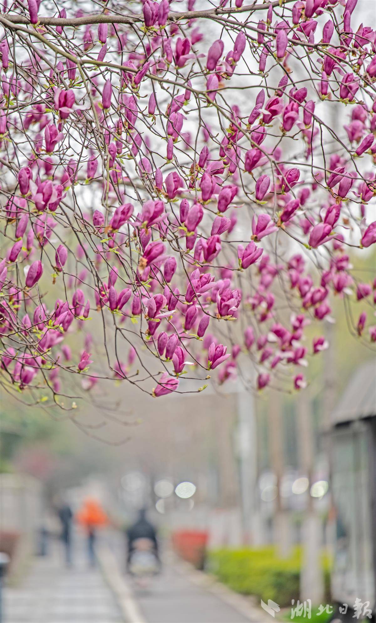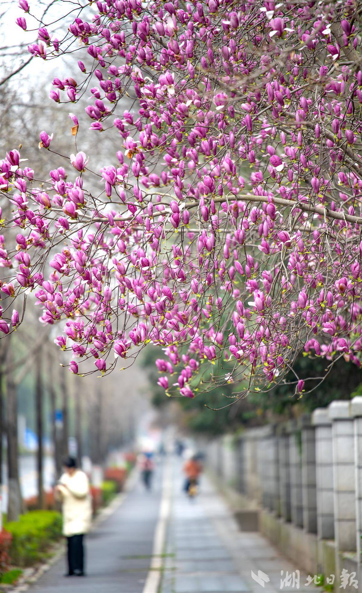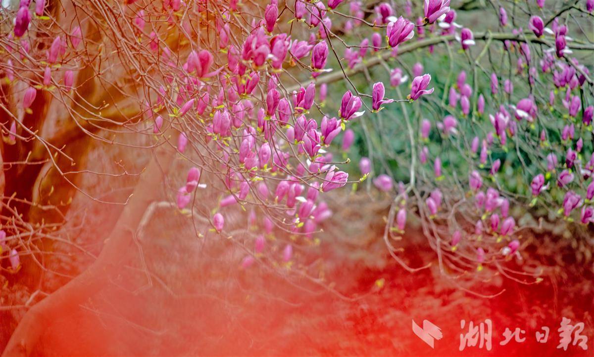 3月20日,春分,武汉市武昌东湖路玉兰正值盛期,洁白淡紫的花瓣缀满枝头,与东湖碧波相映成画,引得市民游客驻足打卡。不止东湖,龟山早樱、江滩玉兰、花博汇郁金香、武昌江滩油菜花接力盛放;精准花期预报、水陆赏花专线、文旅配套同步上线,一座被繁花包裹的江城正以最美姿态迎接八方来客。(湖北日报全媒记者 刘曙松 摄)