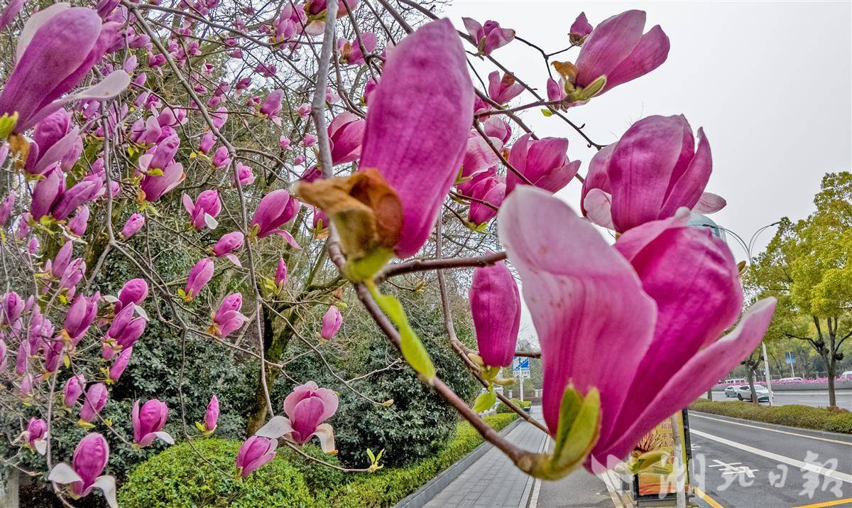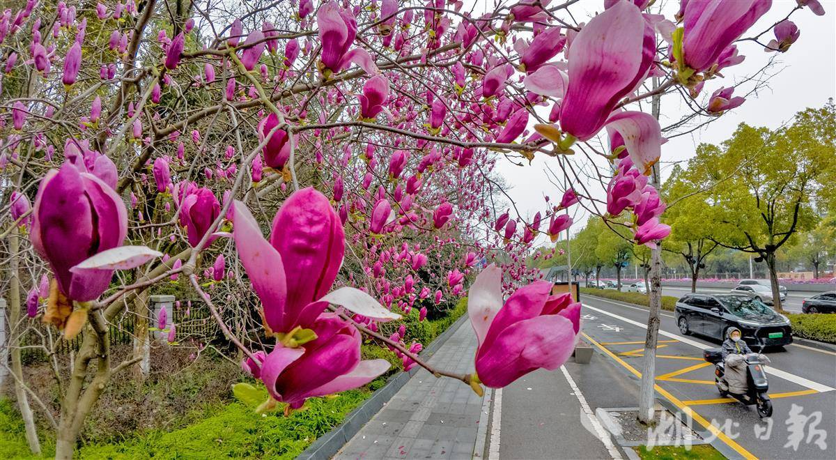 3 月 20 日,春分节气,武汉市武昌区东湖路边玉兰花迎来盛花期。