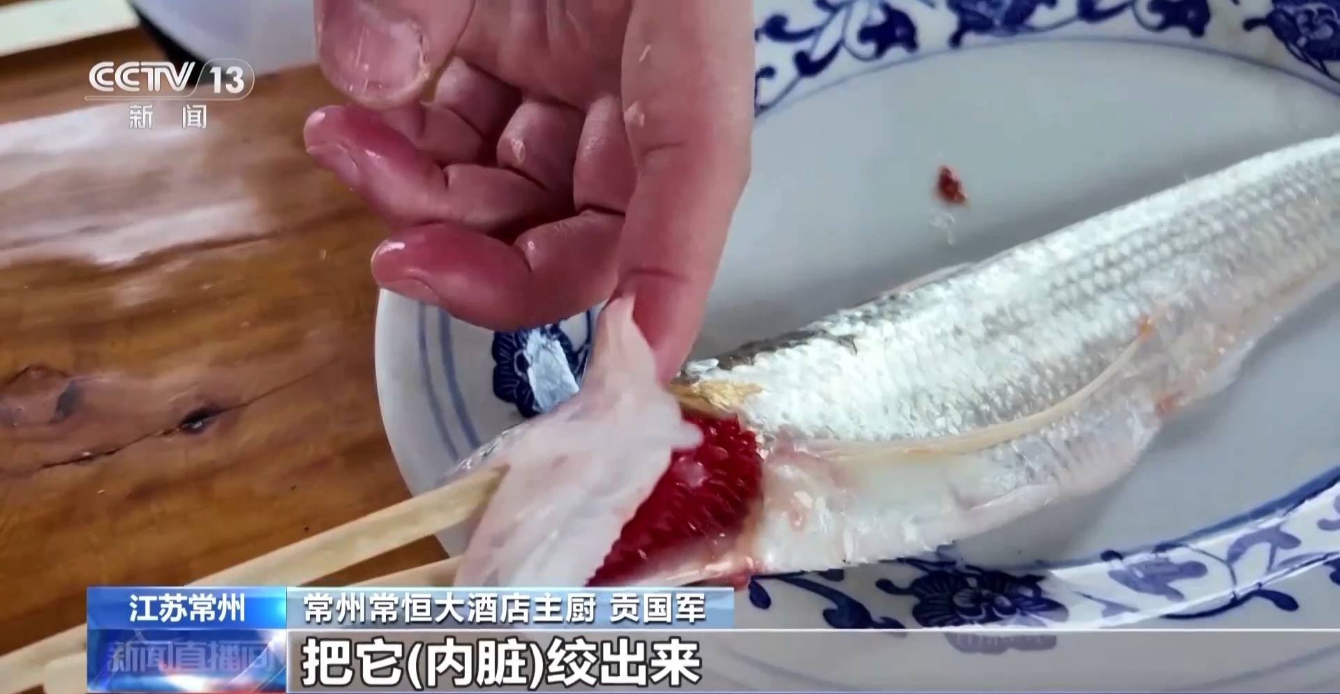 常州常恒大酒店主厨 贡国军:我会用筷子通过鳃把它打开之后,把内脏绞出来,这样出来的刀鱼比较完整。