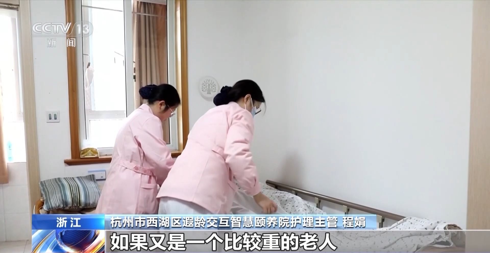 杭州市西湖区遐龄交互智慧颐养院护理主管 程娟:比如翻身,护理员就要协助他。如果是一个比较重的老人,夜班只有一个护理员的话就没办法执行了。