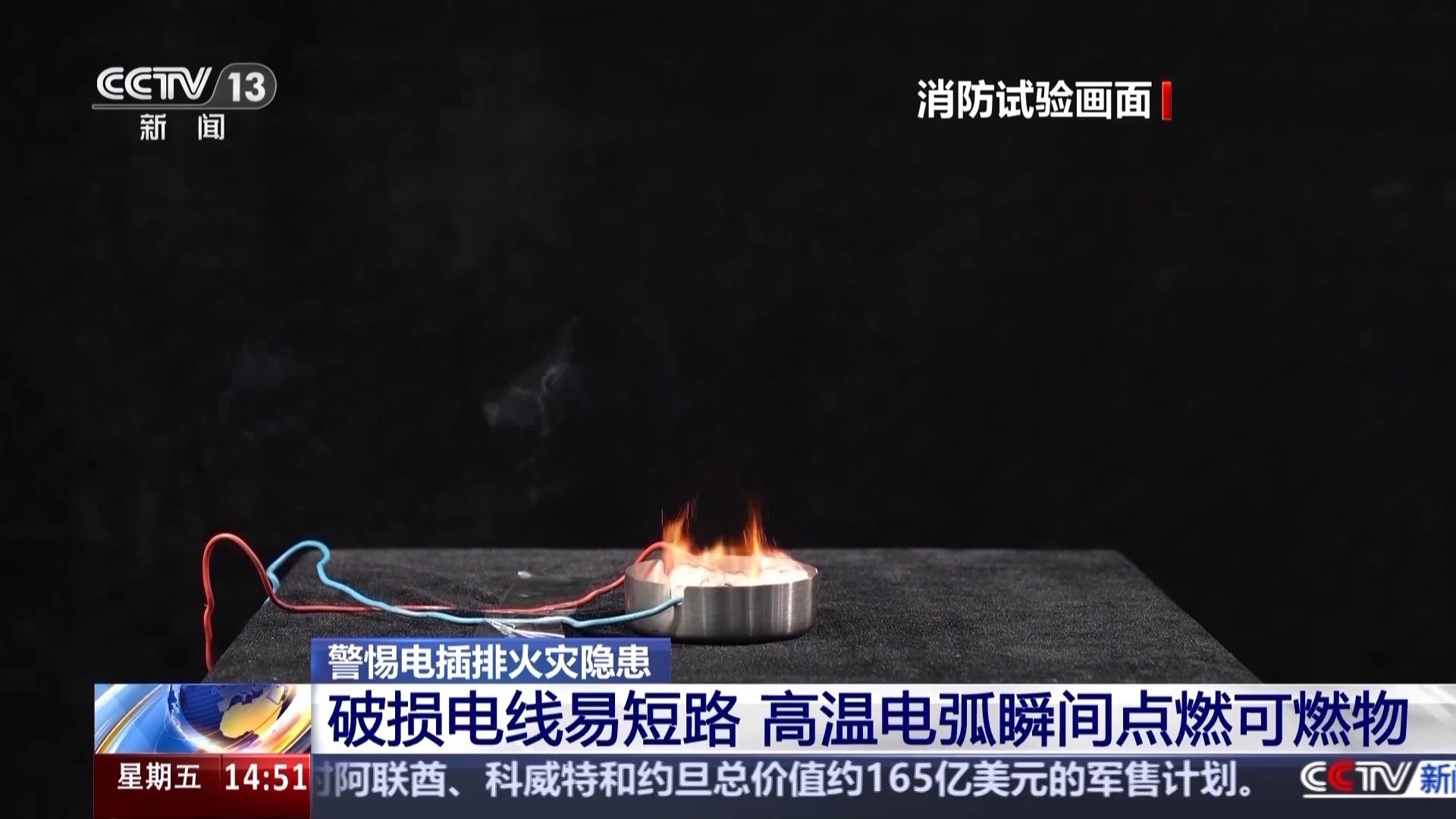 电线老化破损也是一个安全隐患。试验中,消防人员将一根电线破坏,模拟电线破损后发生短路的情况。可以看到,通电的一瞬间,电线接口处火花四溅,下方棉花也被点燃。消防人员介绍,这个刺眼闪光是电线短路时产生的电弧。温度可达2000℃,足以引燃常见可燃物。