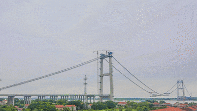 在主缆架设过程中,中交二航局项目团队严格控制索股牵引、入鞍、入锚等各工序,利用温差较小的夜间进行精准测量、精确调索,成功将偏差控制在“毫米级”,确保了主缆线形的精准度。此外,项目团队还研发了上部结构施工数字孪生系统为主缆架设“保驾护航”。“我们采用‘双线往复’的施工方式,索股牵引完成的同时另一组牵引器能够自动归位,为牵引下一根索股做准备,做到了‘无缝衔接’。有效缩短了索股牵引的间隙,使得单根索股的牵引时间控制在2小时左右,一天能够牵引架设4至6股。最终我们仅用56天时间,就将169根索股全部架设完成,创造了‘双柳速度’。”陈诚表示。