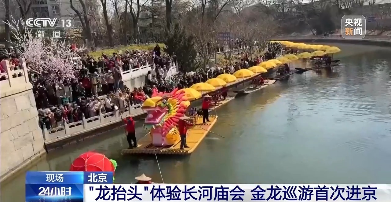 总台记者 杜正普:春分遇上龙抬头,万事皆是好兆头,我现在是在长河庙会的活动现场,在我身边的就是此次庙会的重头戏,金龙巡游用到的竹筏,团队来自广西阳朔,这条金龙是第一次在北京亮相,全长200多米,由36个竹筏连接,金色巨龙在筏工的默契操作下蜿蜒前行,龙身随着水波自然摆动,像真的在水里游动。