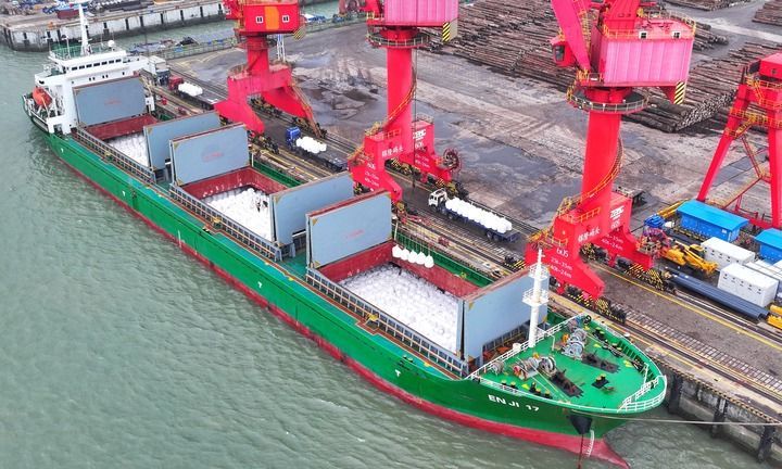 2026年3月18日,在江苏张家港锦隆重件码头,国际航行船舶在泊位上有序卸运进口化肥(无人机照片)。新华社发(赵国政摄)