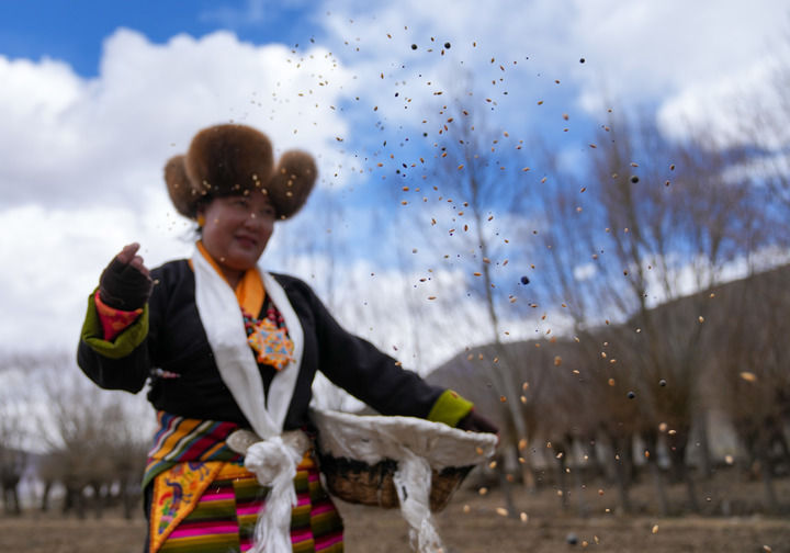 2026年3月16日,西藏山南市结巴乡结巴村村民身着盛装,在新犁开的田地上播撒种子。新华社记者 晋美多吉 摄