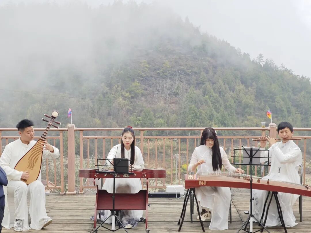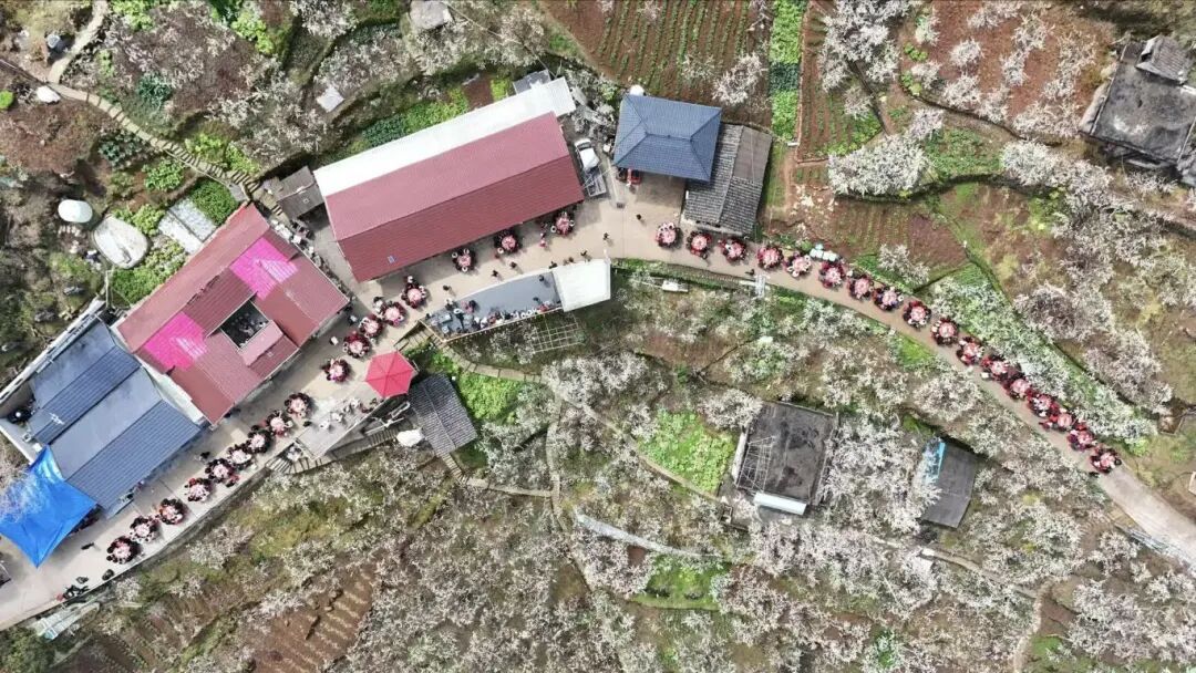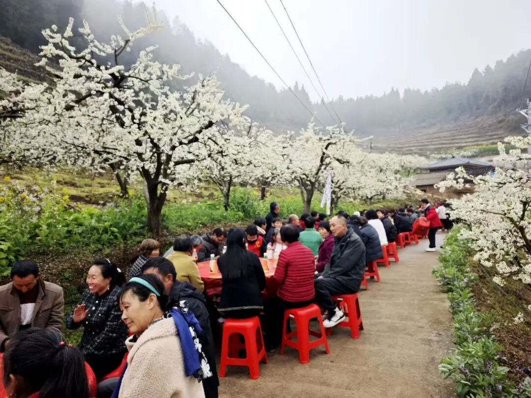 活动当天,陈郑丽照常打开手机拍视频。镜头里,花枝摇曳,花瓣似雪般飘落到桌上,乡亲们围坐吃饭,她对屏幕那头的粉丝说:“这就是我们高潮村的花海,欢迎大家来赏花!”