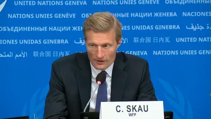 世界粮食计划署副执行干事卡尔·斯考在新闻发布会上发言。