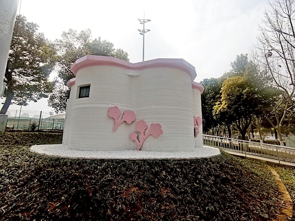 安信环保公司负责人陈凯介绍,该公司把建筑垃圾处理后产生的再生料,以30%至40%的比例融入3D打印建筑材料中,实现了建筑垃圾循环利用。建筑设计上,融合樱花形态的柔美与3D打印的精准高效,实现了自然环保与智能建造的完美融合。