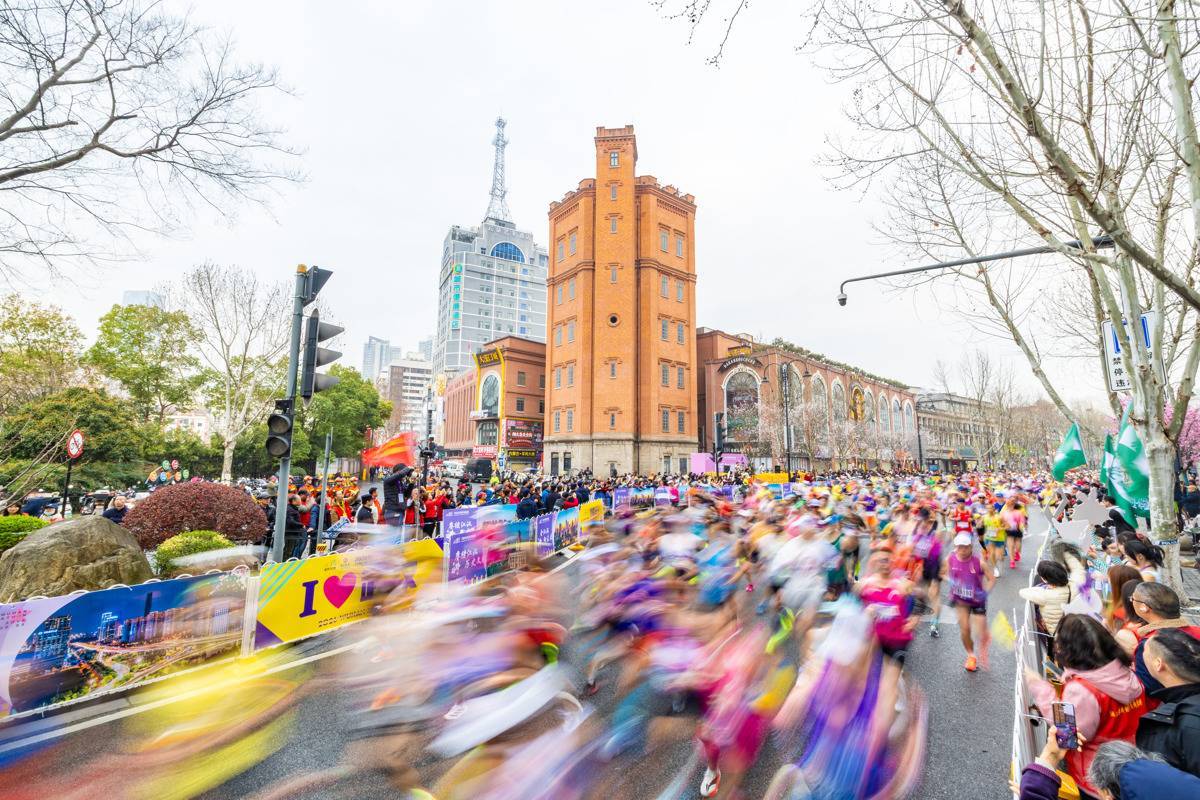 2026年3月22日,2026武汉马拉松鸣枪开跑,图为选手们跑过武汉汉口百年中山大道上的汉口水塔。(湖北日报全媒记者 何宇欣 摄)
