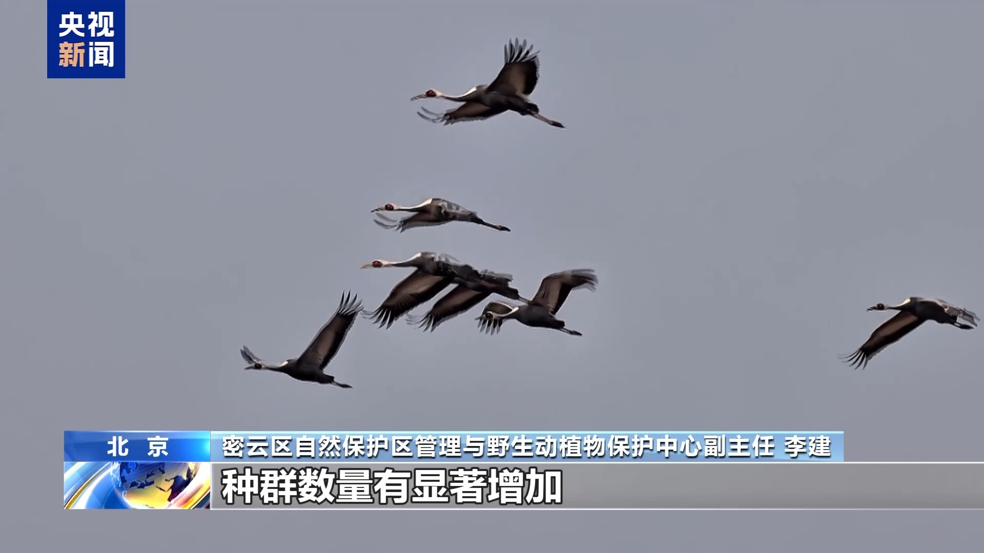 密云区自然保护区管理与野生动植物保护中心副主任 李建:像珍稀物种白枕鹤、灰鹤、东方白鹳以及一些雁鸭类的鸟种,和往年相比,种群数量有显著增加,这场万鸟翔集、鹤舞长天的生态盛景,还将在密云区持续半个月左右。