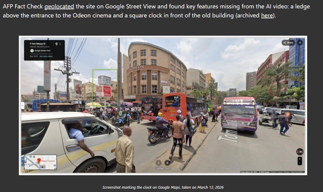 另外,法新社通过比对地图上的街景照片发现,视频缺失了现实街景中的明显元素,更加验证其AI生成视频的可能性。