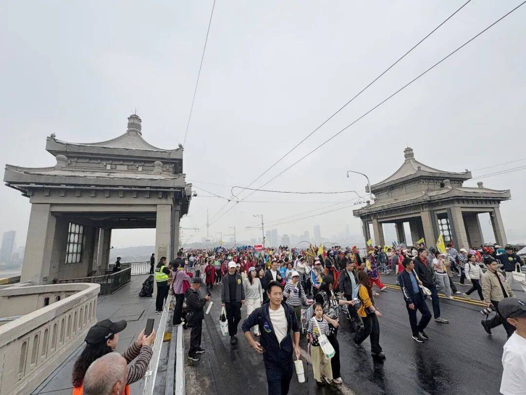 约2000名“跟着汉马走大桥”市民游客按组列队,沿龟山北路徒步而上,途经龟山公园北门、核心景点,最终登上万里长江第一桥——武汉长江大桥。
