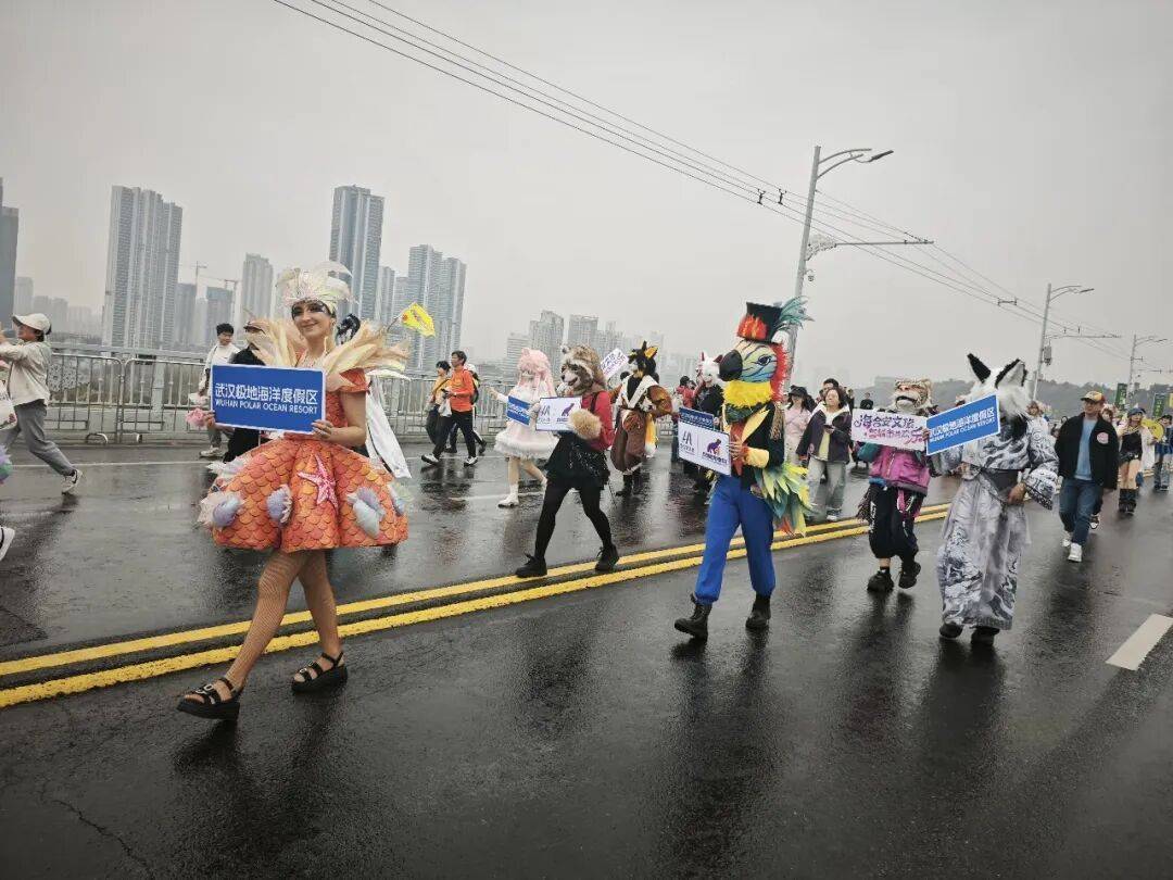 随后,武汉极地海洋度假区巡游方阵亮相,热情洋溢的外籍桑巴舞者化身活力使者,踏着明快激昂的节拍尽情摇曳,将热烈如火的南美风情与马戏般的动感狂欢;极地萌宠天团紧随其后,憨态可掬的白鲸、企鹅、老虎、小浣熊、鹦鹉等萌趣人偶灵动俏皮、可爱出圈,将极地海洋的治愈与奇幻,洒满江城街头!
