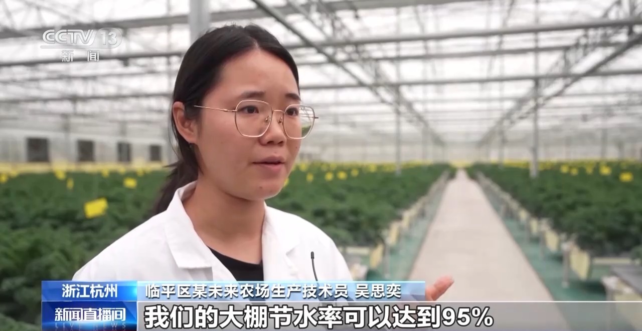 临平区某未来农场生产技术员 吴思奕:与传统土培种植相比,我们的大棚节水率可达95%,节肥率达90%。在人工方面,传统农业管理两个大棚共8亩地需要4个人,而现在我一个人就能看管两个大棚。