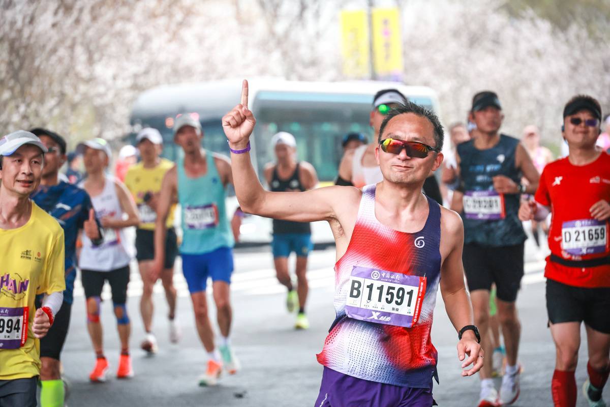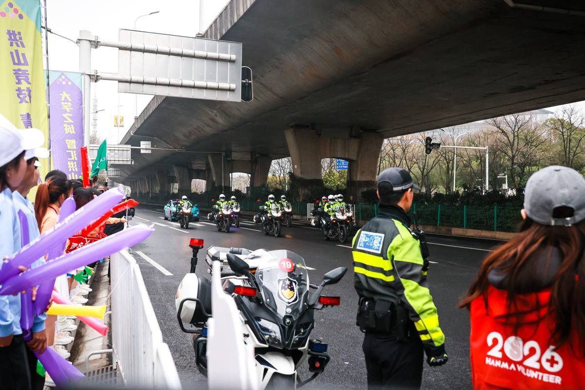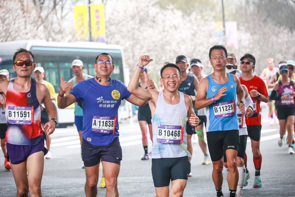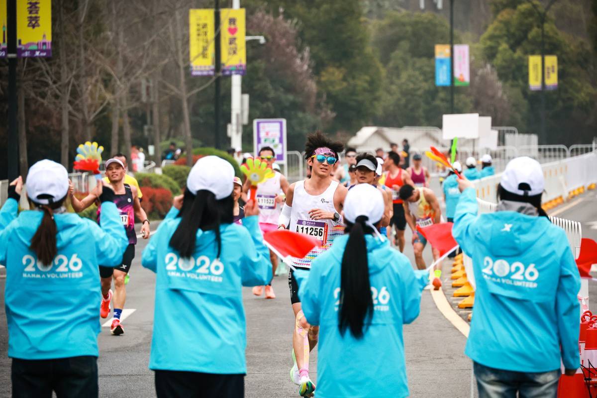 3月22日,2026武汉马拉松开跑,何杰等全马跑者首次体验东湖白马道,并跑过曾经的全马终点欢乐谷。(湖北日报全媒记者 时龚 摄)