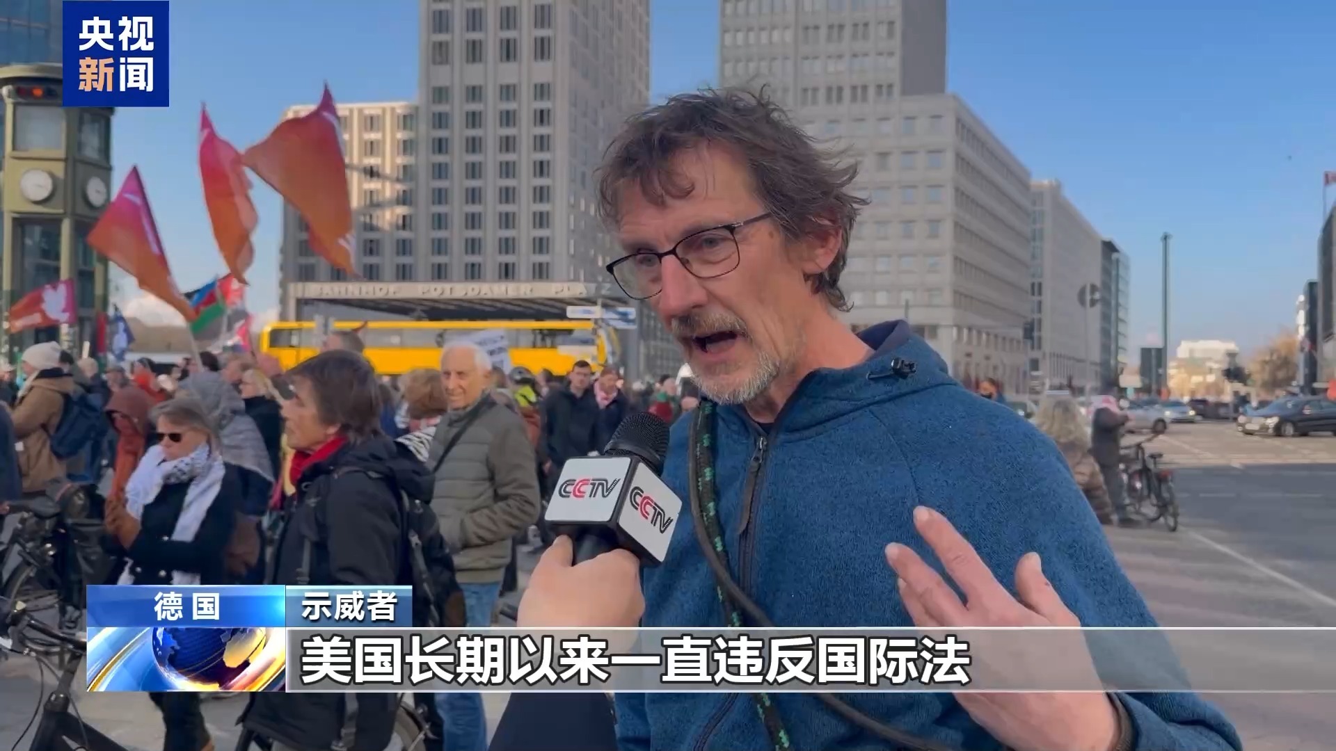总台记者 贺俊强:我现在所在的位置是德国首都柏林市中心。在我身后,大批示威者正聚集在一起,举行抗议活动。抗议者手持标语、高喊口号,反对美国和以色列近期对伊朗发动的军事打击行动。抗议者普遍认为,美国和以色列的军事行动将进一步加剧中东地区紧张局势,也可能引发更大范围的冲突。