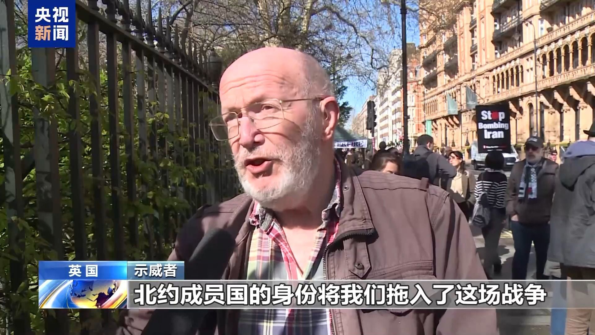 示威者:北约成员国的身份将我们拖入了这场战争。大多数英国民众都反对这场战争,所有民意调查都显示了这一点。大多数美国人也反对这场战争,显然所有中东地区的人民也反对。这是一场极不受欢迎的侵略战争。