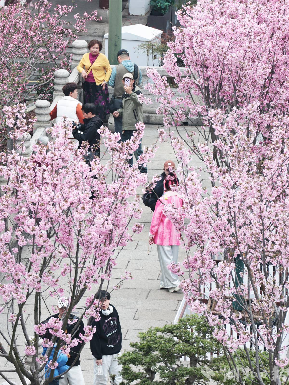 3月22日,黄鹤楼广场樱花景观树进入盛花期,粉白花朵如云似霞,花香浮动,与黄鹤楼飞檐翘角相映成趣,勾勒出独属于江城的春日诗意。不少游客驻足打卡、拍照留念,用镜头定格古建筑与浪漫樱花交融的绝美瞬间。古韵与春色碰撞,历史与温柔相逢,绘就一幅动人的江城春日画卷,成为武汉春季热门打卡地。(湖北日报全媒记者 陈迹 摄)