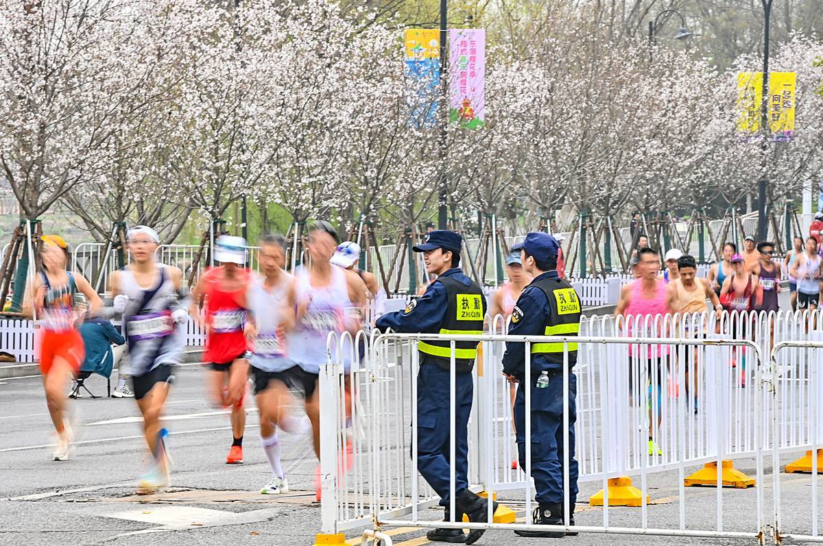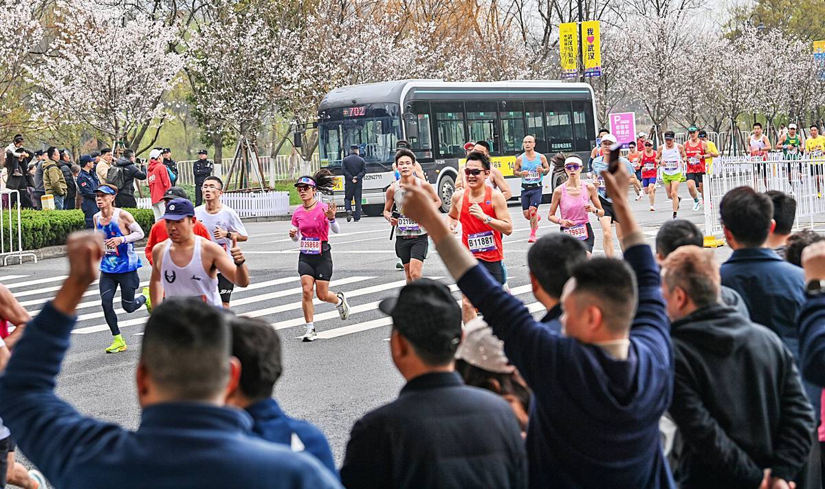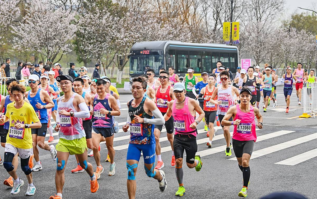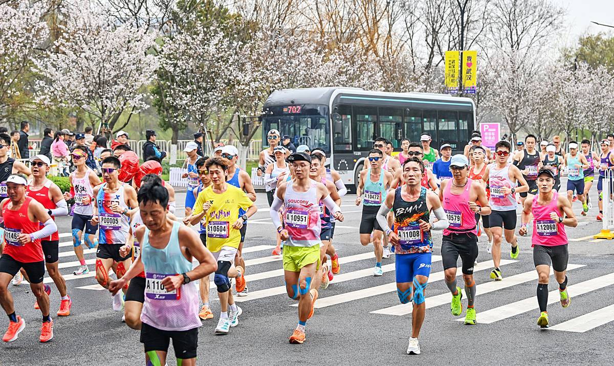 3月22日,欢乐大道东湖绿道入口处100多米赛道上,临时摆放的樱花盆景已盛开,跑友与粉樱同框太浪漫了。2026汉马赛道,近4000株樱花一路陪跑,60万盆春花“啦啦队”沿途喊加油,花卉气氛组热烈胜往年。青山江滩的樱花彩绘跑道更是氛围感拉满。(湖北日报全媒记者朱熙勇摄)