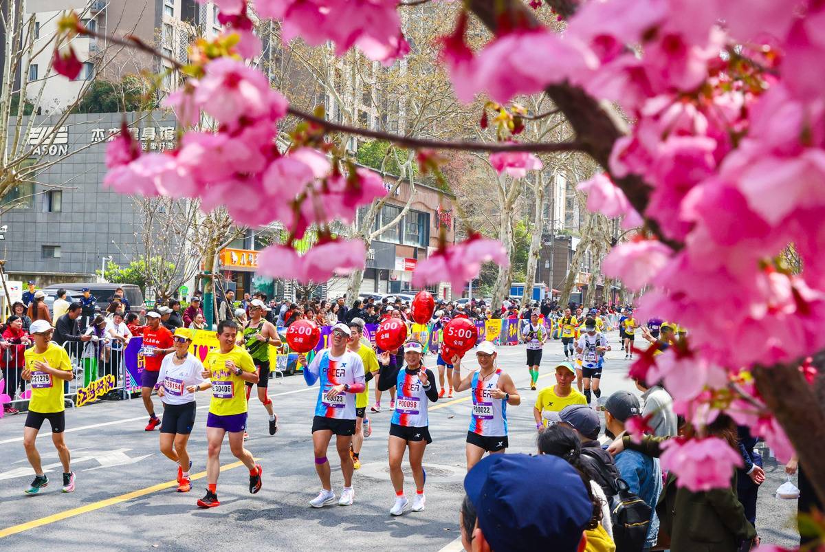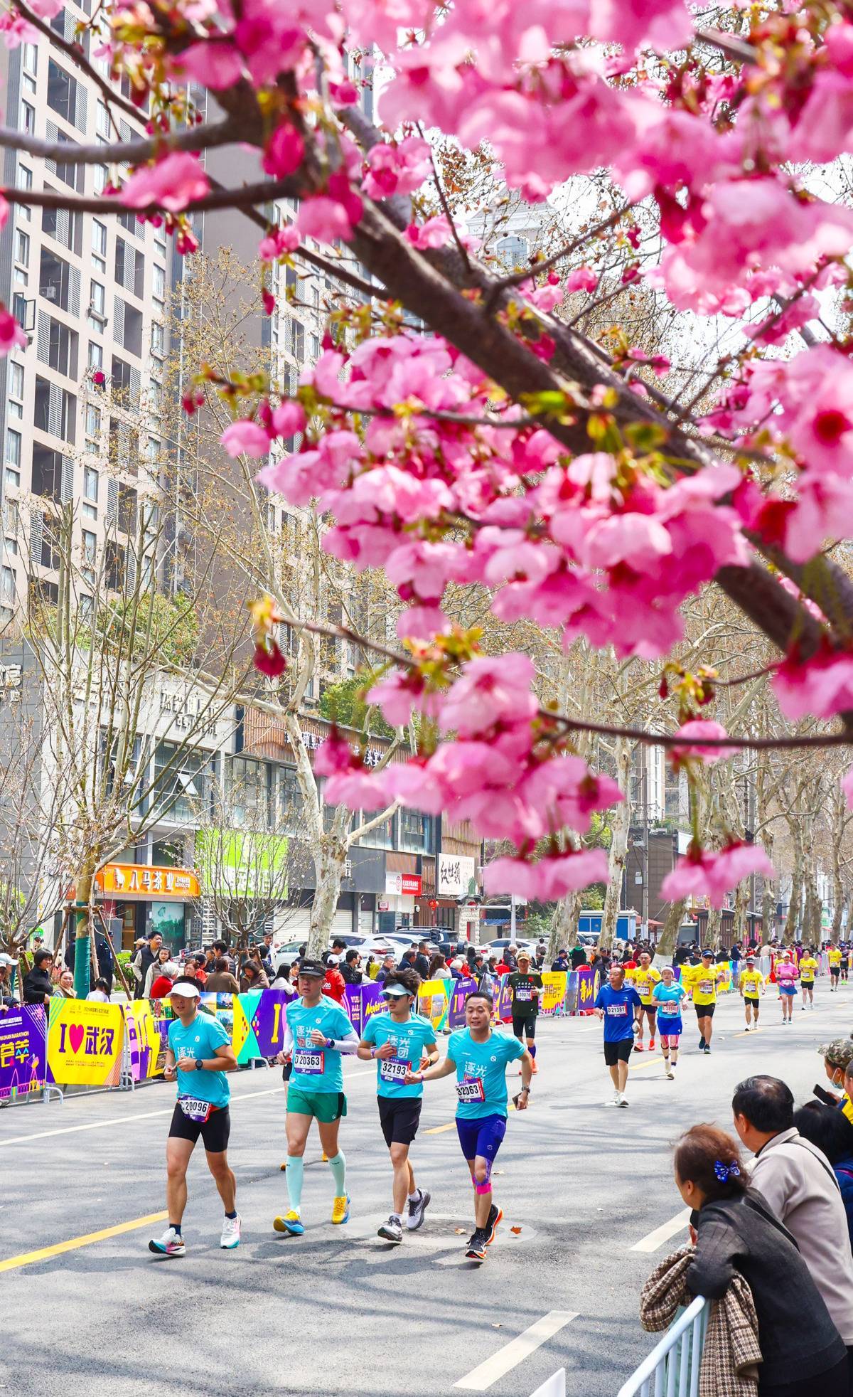 3月22日,参赛运动员从建设三路樱花树下跑过。(湖北日报全媒记者 柯皓 摄)