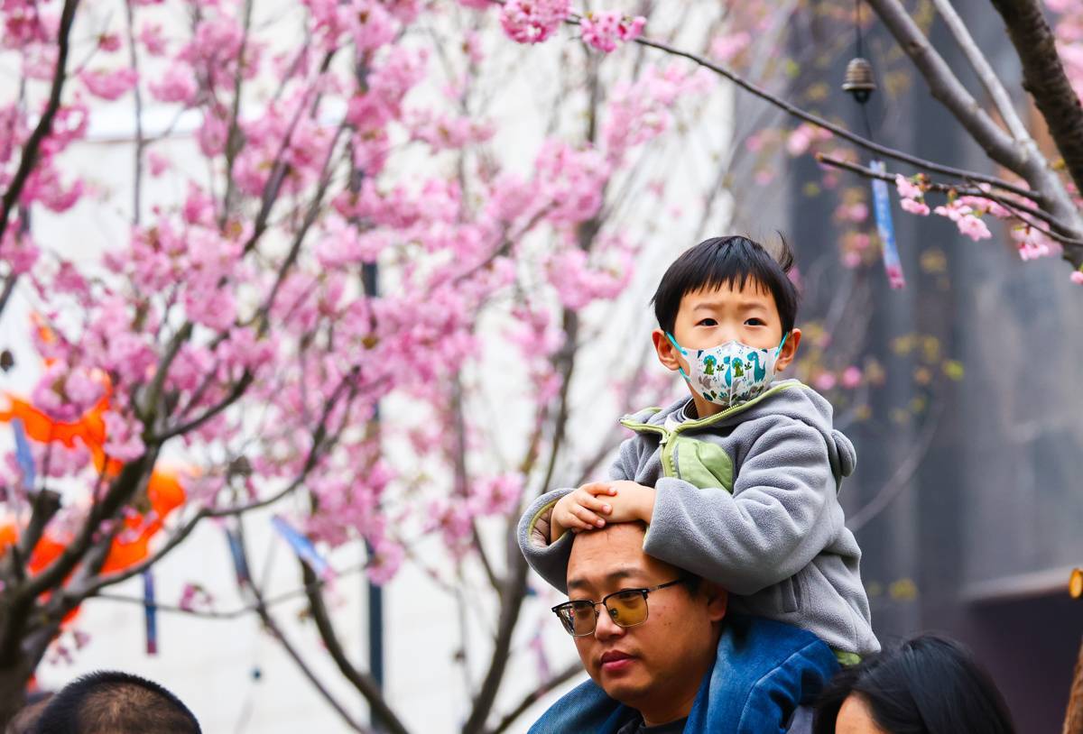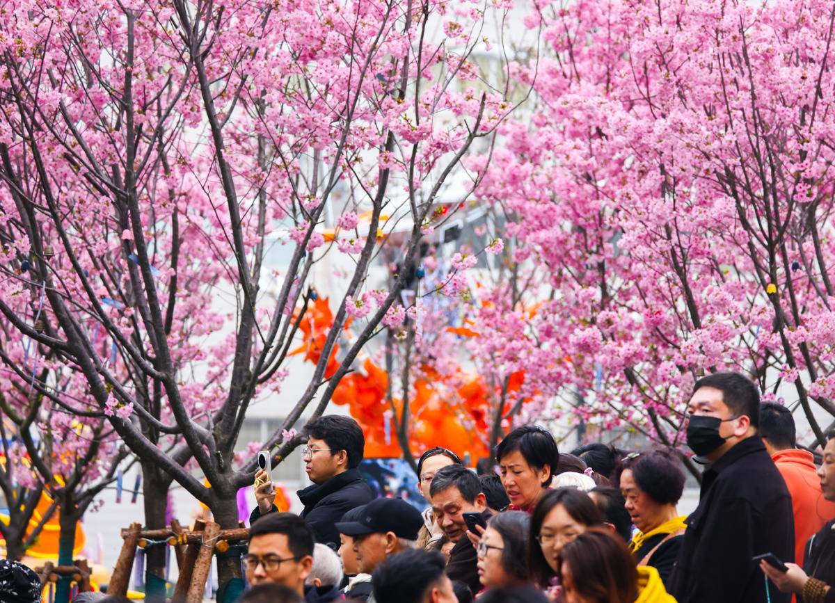 3月22日,市民在樱花树下为参赛选手加油。(湖北日报全媒记者 柯皓 摄)