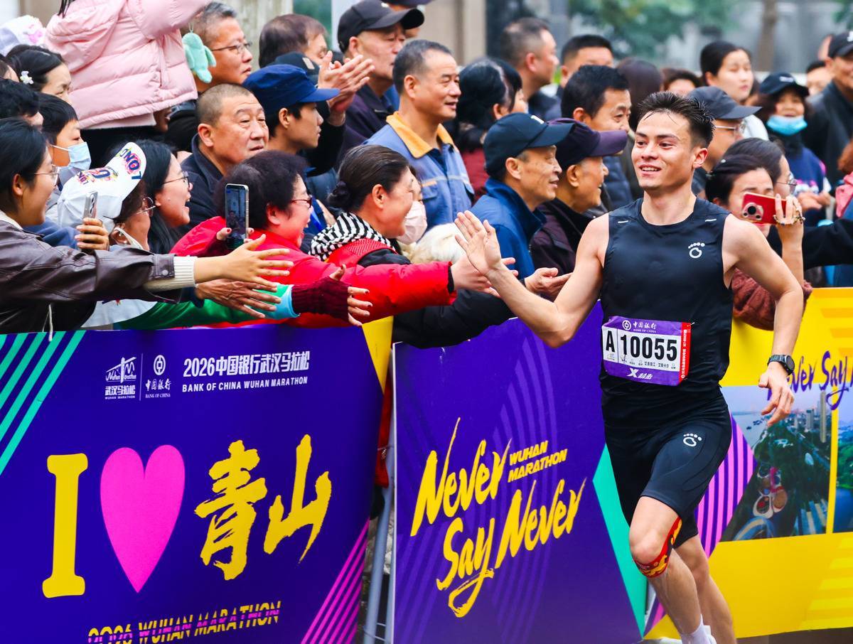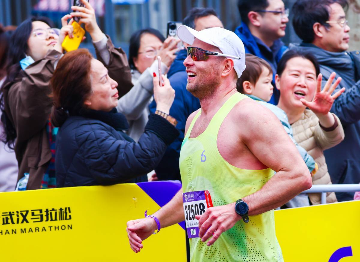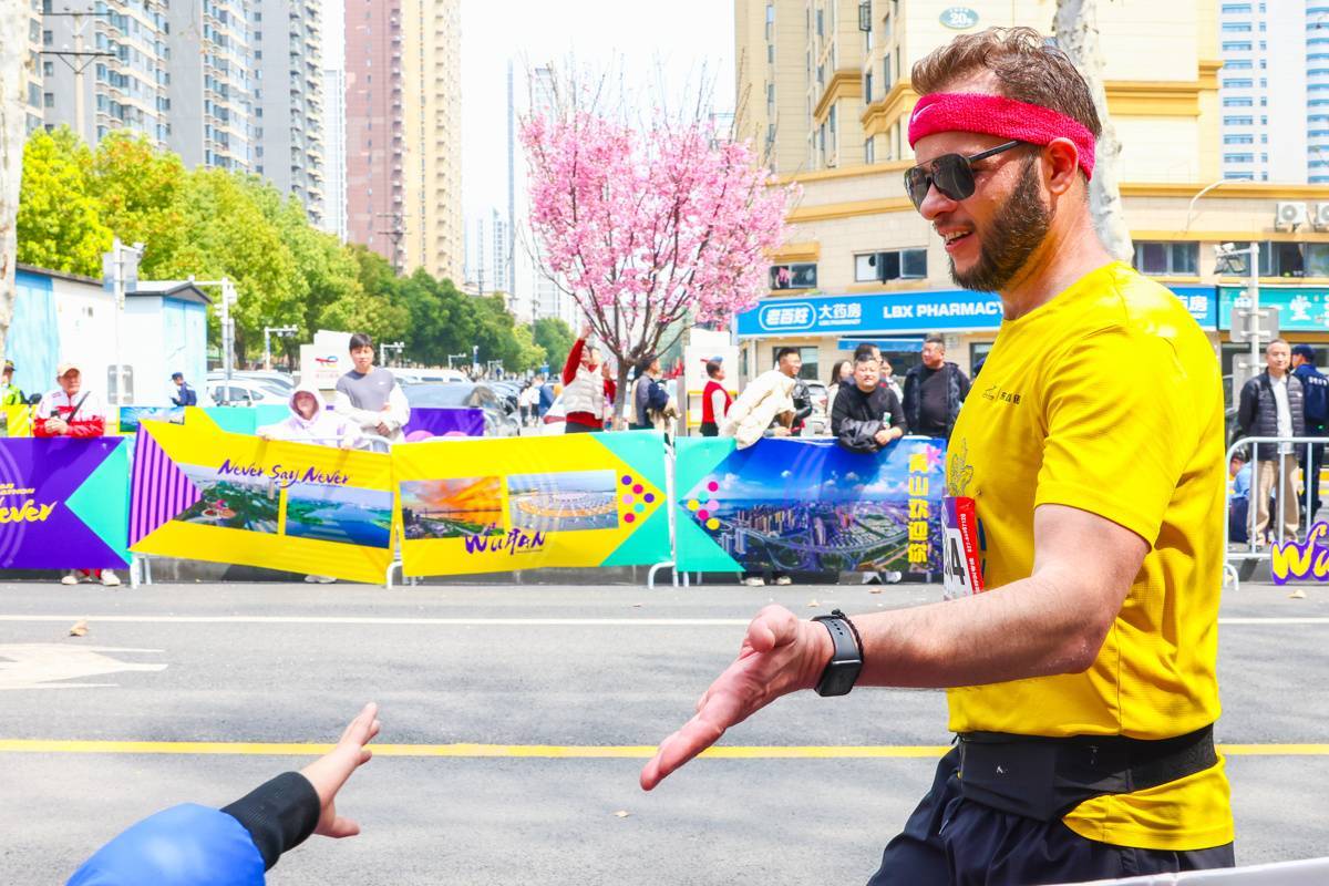 3月22日,外籍选手和赛道旁的观众互动。(湖北日报全媒记者 柯皓 摄)