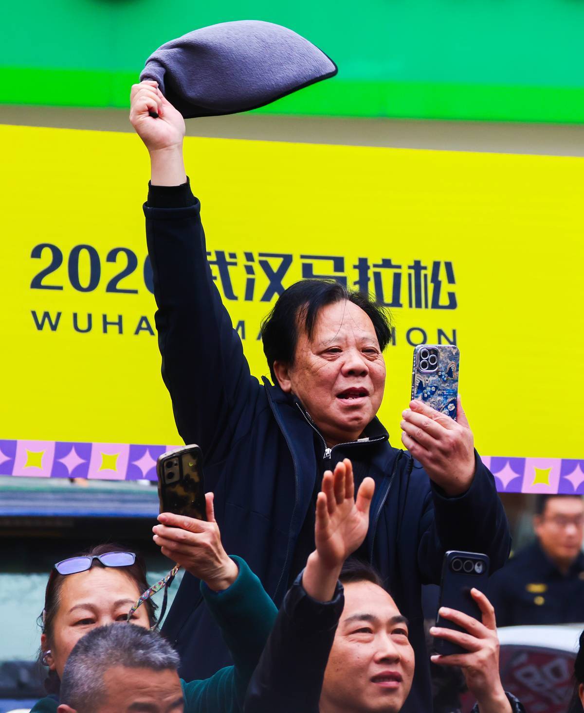 3月22日,一位市民挥舞着抹布为参赛选手加油。(湖北日报全媒记者 柯皓 摄)