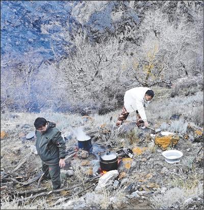 团队成员在野外做饭。