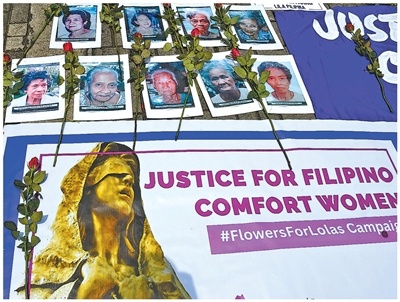当地时间2025年8月14日,抗议者在菲律宾首都马尼拉罗哈斯大道旁竖立慰安妇雕像的旧址附近,展示慰安妇的标语和肖像。