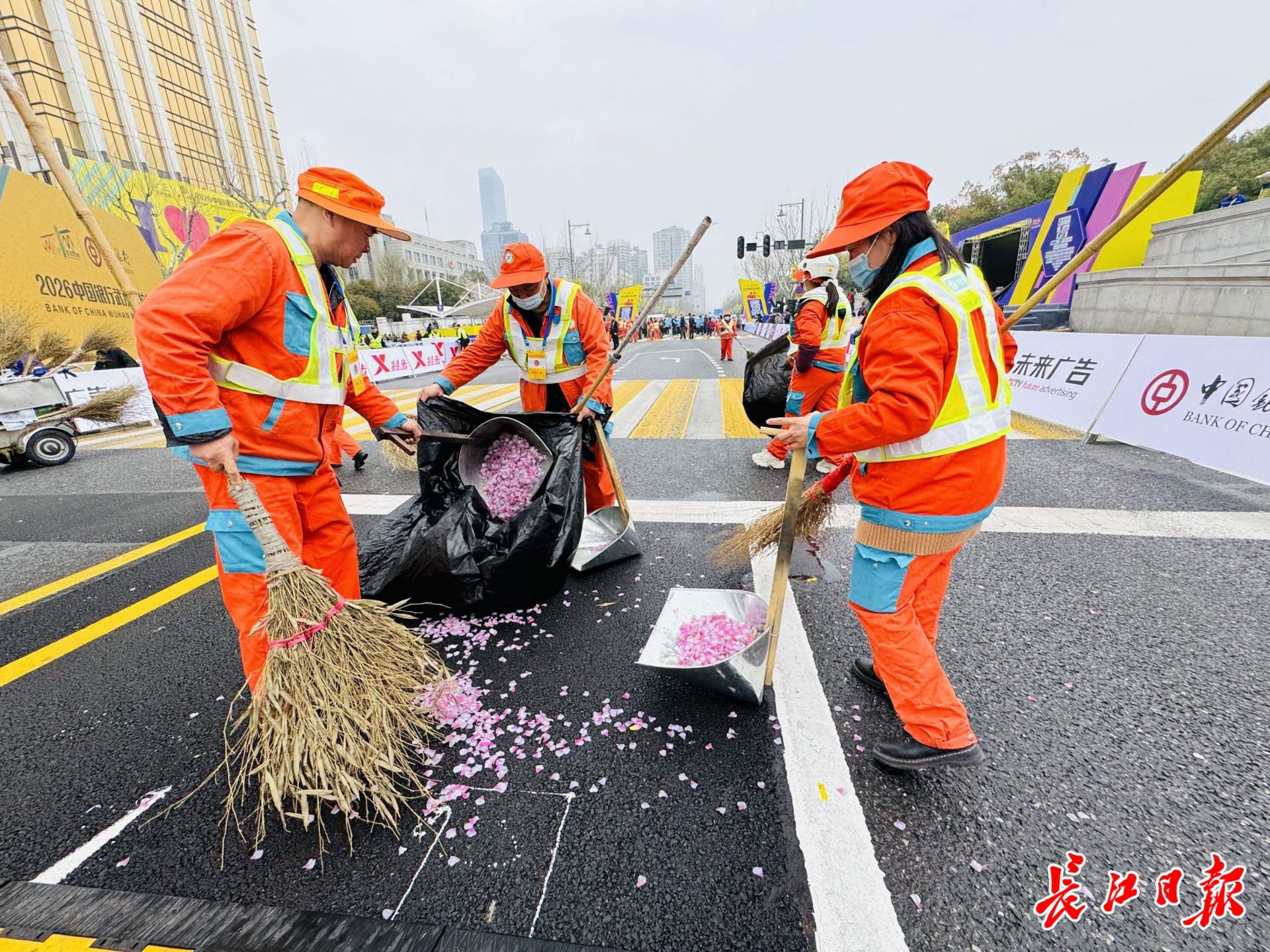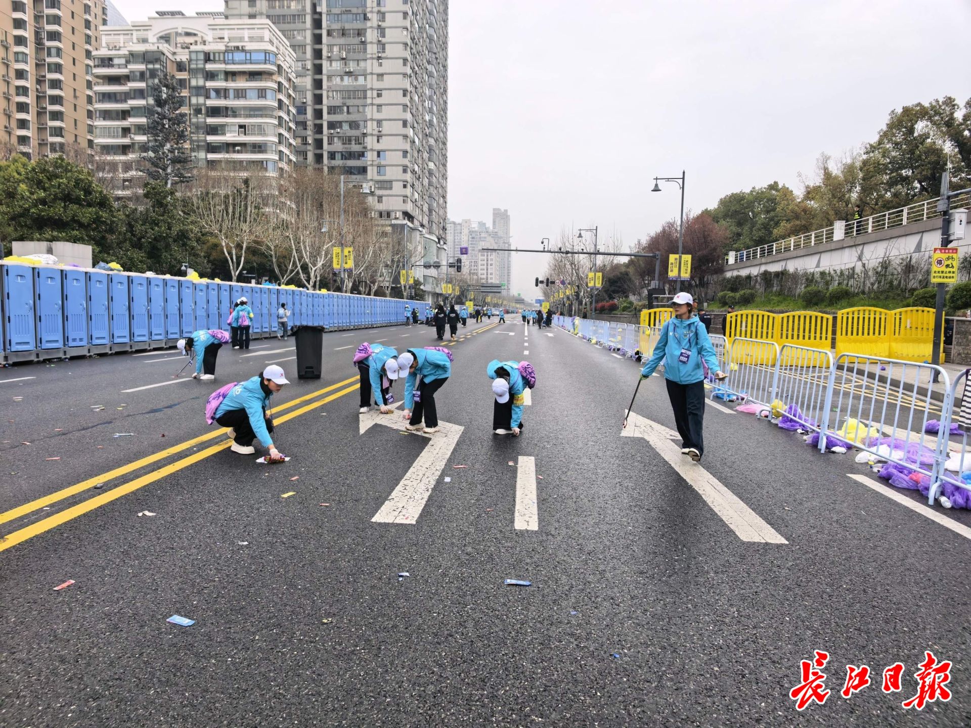 3月22日7时许,汉马选手出发完毕,志愿者开始清理路面。长江日报记者孙笑天 摄