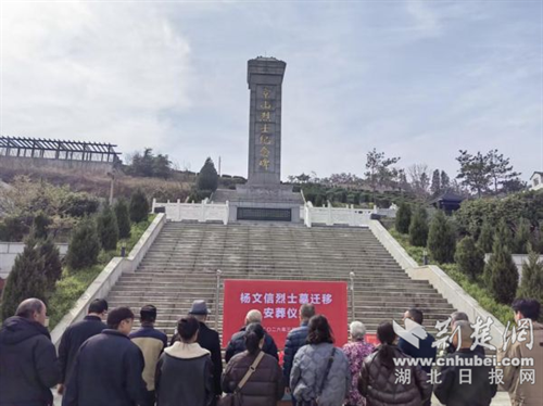 荆楚网(湖北日报网)讯(通讯员 胡枫 腾腾)青山巍巍埋忠骨,溾水幽幽慰英魂。3月20日,京山市在烈士陵园举行杨文信烈士墓迁移安葬仪式,市退役军人事务局、曹武镇等相关负责同志、烈士亲属等30余人参加活动。