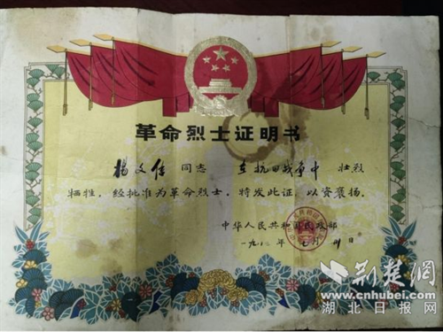 据悉,安葬仪式前举行了一场特殊的捐赠仪式。烈士亲属将珍藏多年的《杨文信革命烈士证明书》郑重捐赠给烈士陵园。这份承载着家族记忆和革命荣光的证书,将被陈列于即将布展的京山烈士纪念馆。“证书留在家里,只能是我们一家人的念想;捐给陵园,就能让更多人看到,让爷爷的精神激励更多的人。”烈士嫡孙杨洁说。从“小家”珍藏到“大家”记忆,这份捐赠是烈士精神从家族传承升华为社会教育的生动教材。