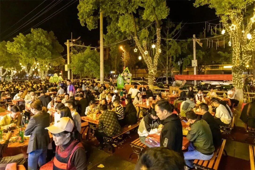 赏罢花海,暮色渐浓,记者来到安陆府东烧烤夜市一条街,这里以盛唐风格为底色,红灯高挂,古色古香,是安陆夜市经济的核心地标。
