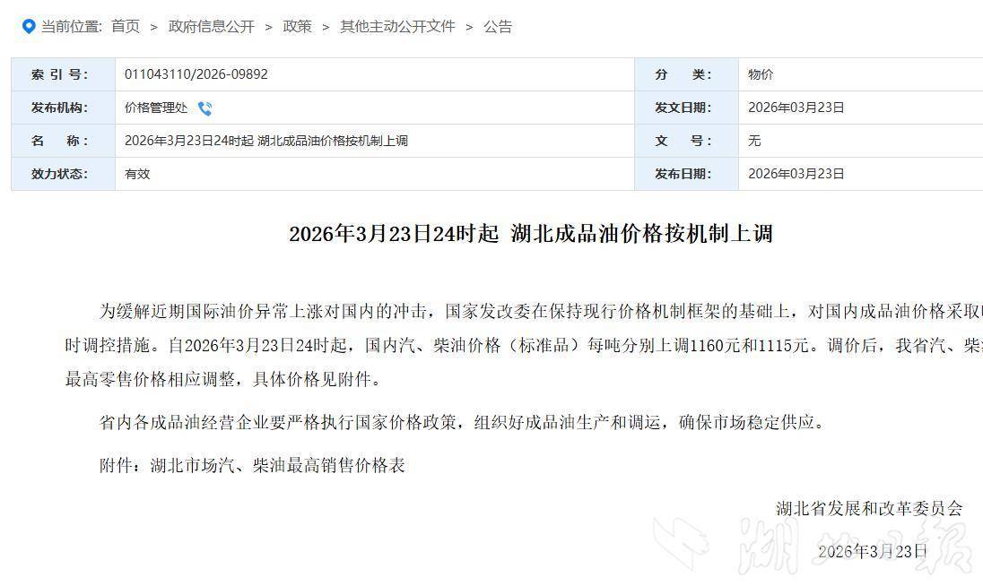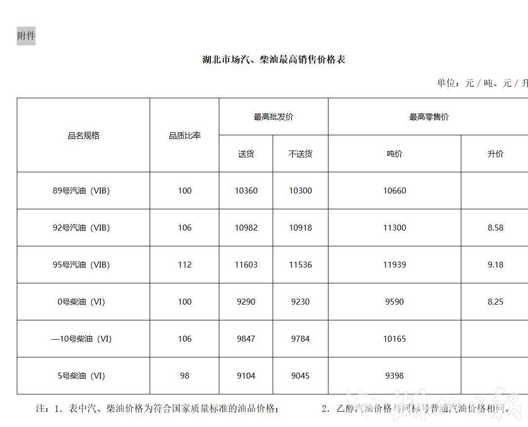 湖北日报讯(记者谢慧敏)我省此轮油价调整正式确定。从省发改委价格管理处获悉,为缓解近期国际油价异常上涨对国内的冲击,国家发改委在保持现行价格机制框架的基础上,对国内成品油价格采取临时调控措施,我省汽、柴油最高零售价格做相应调整,自3月23日24时起省内92号、95号汽油、0号柴油每升分别上调0.93元、1.00元、0.96元;调价后,92号、95号汽油每升分别涨至8.58元、9.18元,0号柴油每升涨至8.25元。