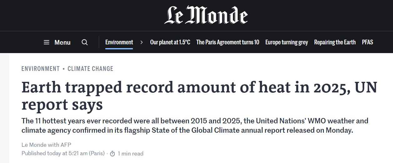 根据WMO报告,地球超过90%的多余热量被海洋吸收,而海洋在2025年经历了有史以来最高的热含量,2005年至2025年间海洋升温速度较1960年至2005年明显翻倍。《卫报》称,这意味着气候变化的影响并非短期波动,而是更深层、更持久的系统性变化。