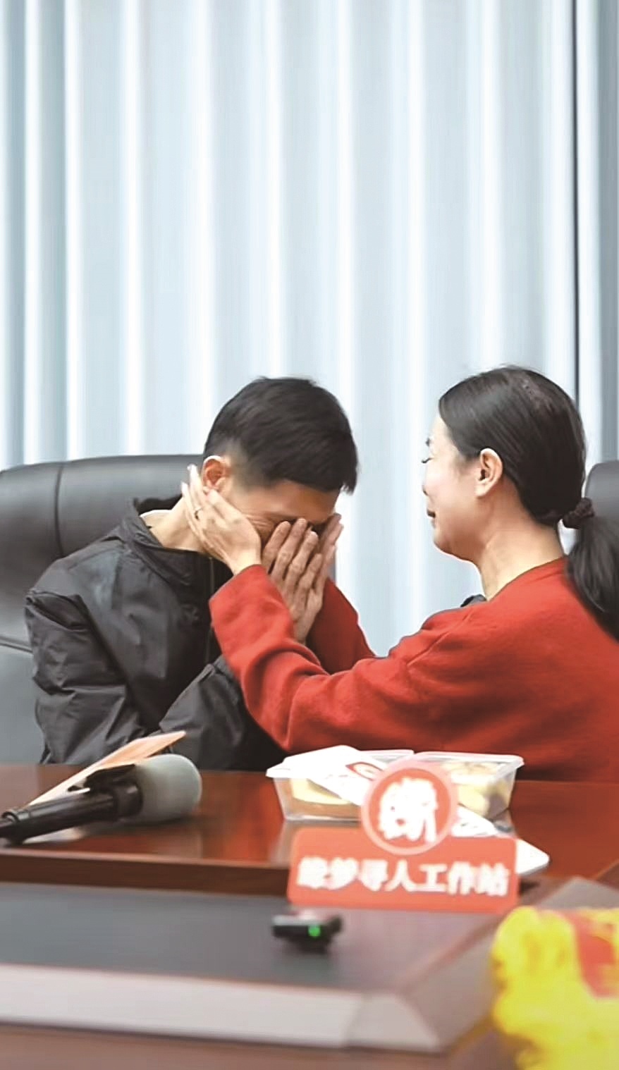 3月23日上午,在南昌铁路公安局南昌公安处,李林见到了寻找多年的弟弟,李林给弟弟准备了面包、大红花,哭着诉说着想念,李鑫安抚着姐姐。