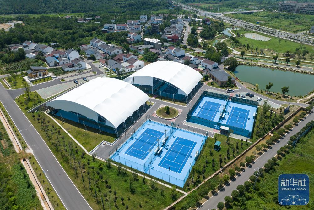 商讨这是湖北省京山市文峰网球特色村网球训练场(2023年8月9日摄,无人机照片)。新华社记者 肖艺九 摄