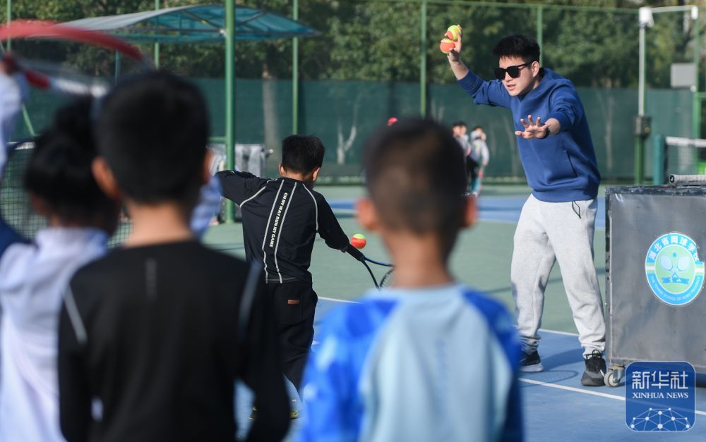 ↑在湖北省京山市文峰公园网球场,教练指导孩子们打网球(2024年3月21日摄)。新华社记者 杜子璇 摄