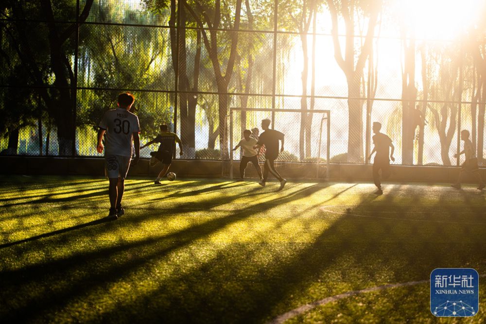 ↑市民在武汉市武昌江滩公园中踢足球(2023年11月20日摄)。新华社记者 杜子璇 摄