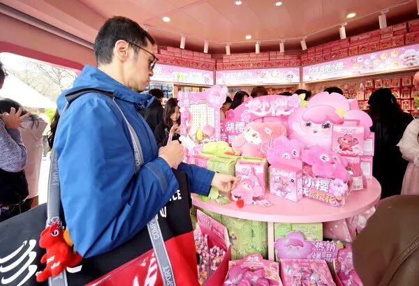 参加汉马的选手邝绍伟正在选购樱花文创。记者何晓刚 摄
