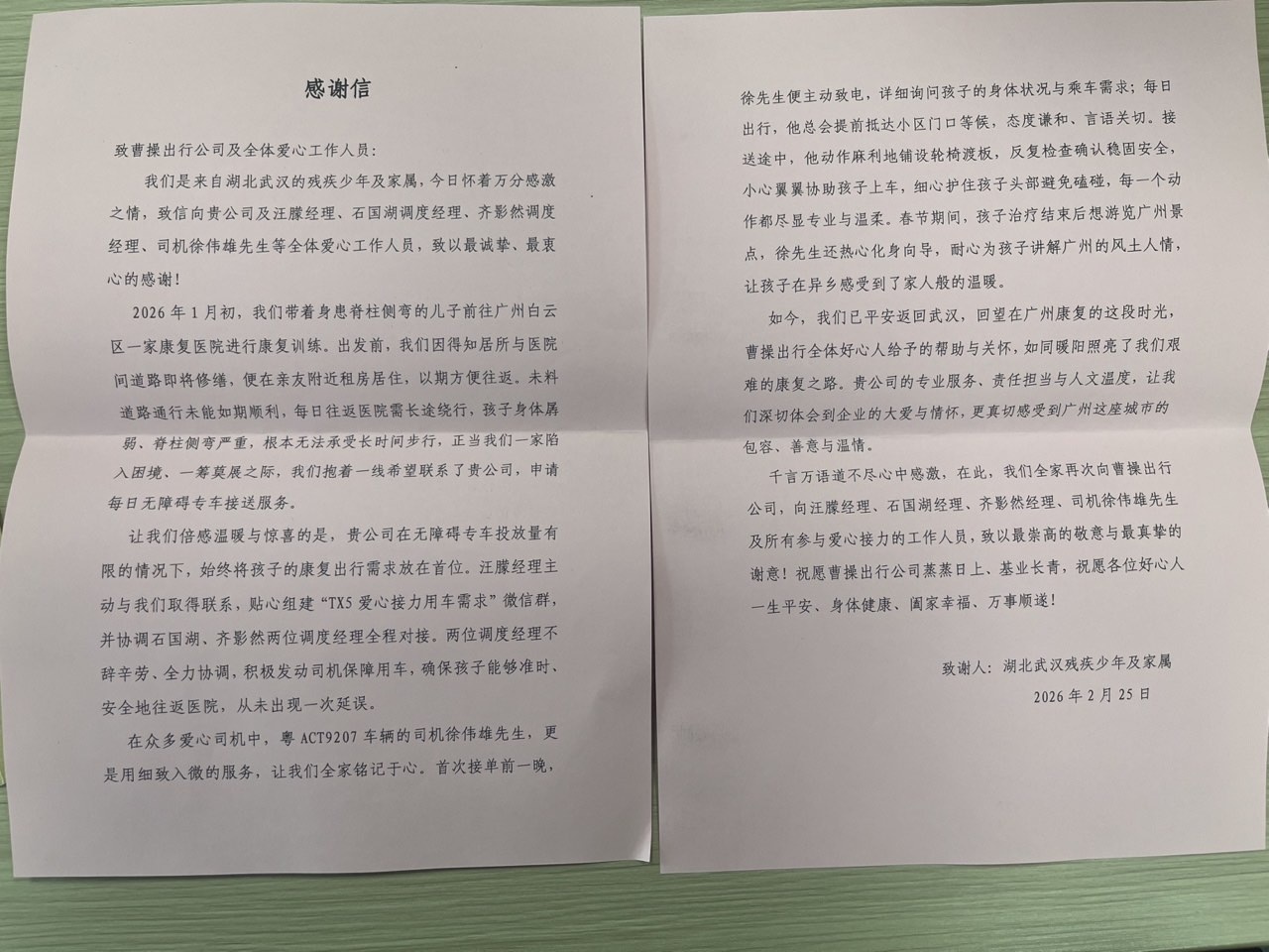 湖北日报讯 (记者黄磊)“我们是来自湖北武汉的残疾少年及家属,今日怀着万分感激之情,致信向贵公司及全体爱心工作人员致以最诚挚、最衷心的感谢!”近日,一封跨越千里的感谢信寄抵曹操出行广州分公司。信中所致谢的,是春节前夕,为武汉一名脊柱侧弯少年接力铺就的“爱心就医路”的一群曹操出行无障碍专车司机。