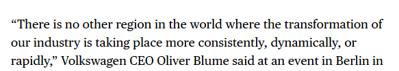文章最后援引大众汽车集团首席执行官奥博穆的话说:“在全球范围内,没有哪个国家能像中国这样,持续、充满活力且快速地推进汽车行业变革。”