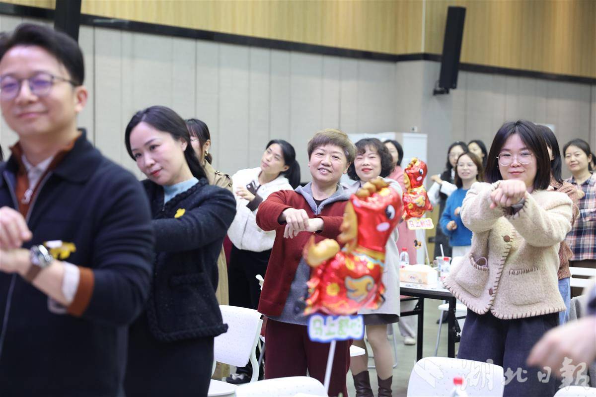 “教育者先要受教育,育人者先要育己。”面对高强度的工作压力,如何为教师的心灵“松绑”?活动伊始,一曲手势舞《快乐小马》瞬间点燃了现场氛围。老师们跟随节拍,用肢体模拟骏马奔腾的姿态,在律动中卸下平日的拘谨与疲惫,让情绪随着音乐自由流淌。这不仅是身体的舒展,更是心灵的“破冰”。