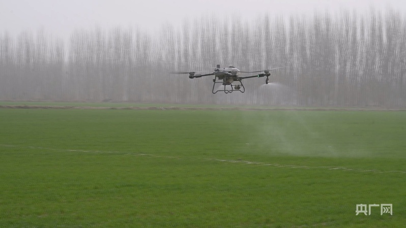 植保无人机正在阿克苏市麦田上空开展飞防作业 (央广网发 热普亥提·阿不力米提 摄)