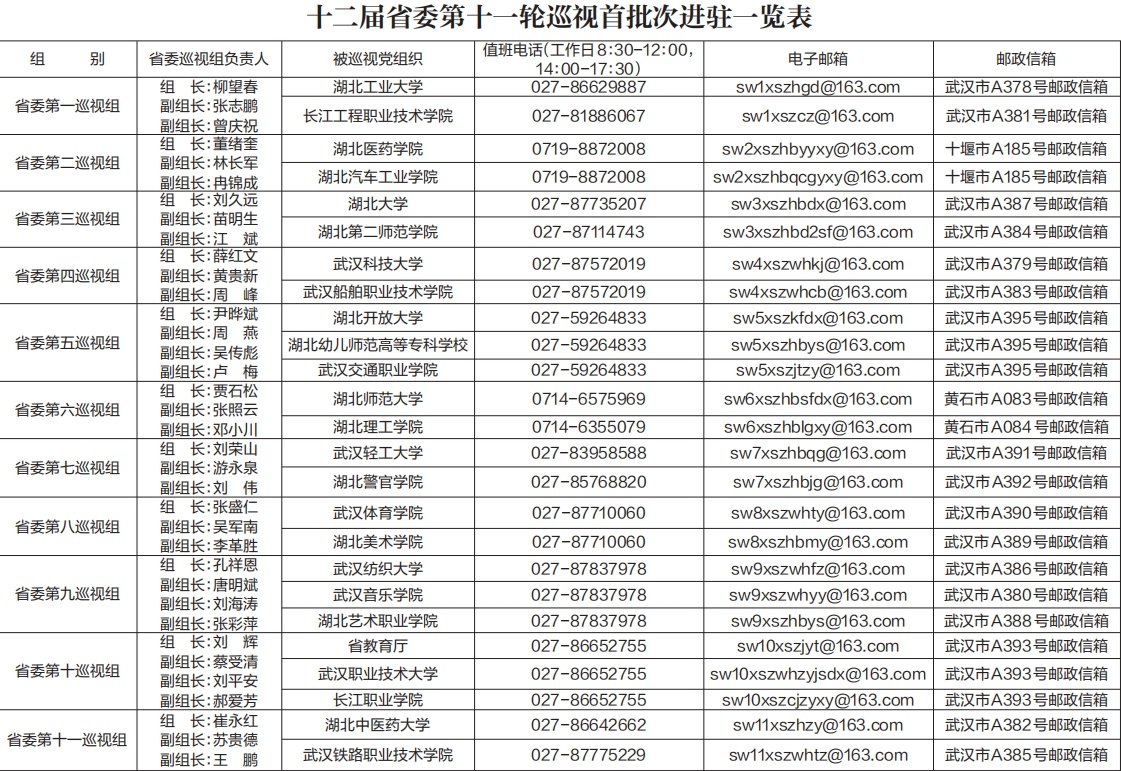 据悉,本轮巡视工作时间为50天左右,巡视期间设立专门值班电话、邮政信箱、电子邮箱和“荆楚码上巡”,主要受理反映被巡视党组织领导班子及其成员、下一级党组织主要负责人和重点岗位领导干部问题的来信来电,重点是关于违反政治纪律、组织纪律、廉洁纪律、群众纪律、工作纪律、生活纪律等方面的举报和反映。巡视组受理信访时间截止到2026年5月12日。