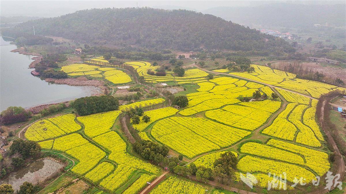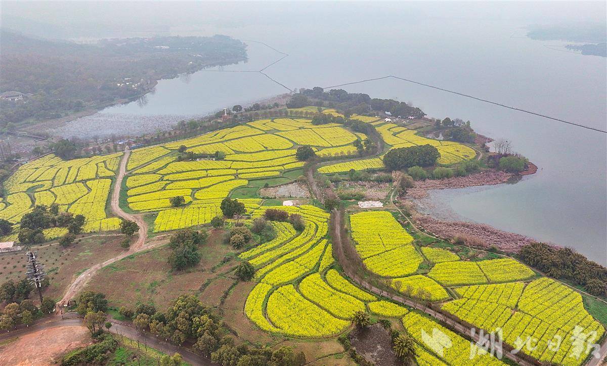 3月23日,鸟瞰位于武汉东湖畔的马鞍山森林公园太渔桥景点,一片连绵500余亩的油菜花田在春日悄然绽放,花田呈现出立体花海景观一眼望不到边。市民游客纷至沓来,在城市森林中嗅一缕清香,在湖光山色里尽享森林野趣。(湖北日报全媒记者 朱熙勇 摄)